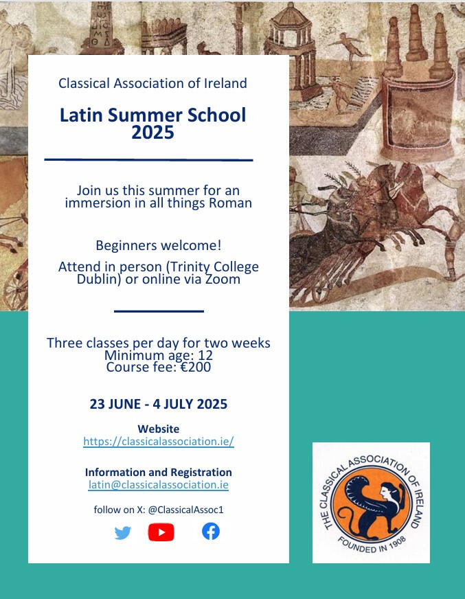 The CAI Latin Summer School is for secondary school students aged 12 to 18. The courses are taught by experienced language teachers and consist of three meetings per day with intervals for study between sessions. The courses will be held in person (Trinity College Dublin, Classics Department, Seminar Room, 6th floor) and online on Zoom.